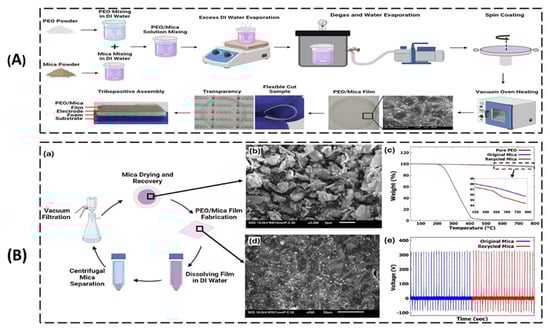 (A) Visual representations of PEO/mica film fabrication; (B) (a) recycling mica cyclic process, (b) SEM representation of recycled mica, (c) TGA comparison for PEO and recycled mica, (d) SEM image of PEO/mica-17 thin film, and (e) electrical output comparison of original mica and recycled mica [].