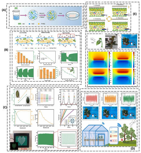 In 2023, Luo et al. [] researched the implementation of a self-powered smart agriculture sensor based on a living plant leaf triboelectric nanogenerator (LPL-TENG). The LPL-TENG must be capable of monitoring eco-physiological stresses impacting a plant’s health and productivity, as this function is essential for food production in smart agriculture. A solution-casting technique was used to form stable and humidity-sensitive composite films with multilayer graphene oxide (GO) and spherical polyvinylsilsesquioxane (PVSQ) and polyvinyl alcohol (PVA). These composite films, along with the living plant leaves, are used by LPL-TENG to convert mechanical energy into electrical energy. This energy conversion allows the LPL-TENG to power small electronic devices and sense plant leaf humidity. The sensor can respond linearly to variations in plant leaf humidity and can also detect high wind speed. This is shown in Figure 7.