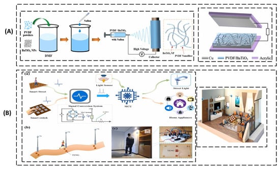(A) Detailed illustration of PVDF/BaTiO3 TENG fabrication, (B) (a) schematic representation of application of BaTiO3/PVDF-based TENG; (b,c) schematic illustration of smart street light system [].