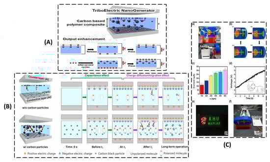 (A) Carbon-based polymer composite TENG. (B) Long Term Operation of TENG using PDMS and PCC schematic illustration. (C) (a) Structural design representation of scotch-yoke-assisted PCC-TENG; (b) operation mechanism of TENG; (c) electrical output voltage of scotch-yoke-assisted PCC-TENG; (d) capacitor charging through PCC-TENG; (e) photographic representation of PCC-TENG operation []; (f) Photograph of the operation of the commercial calculator by using the PCC-TENG.