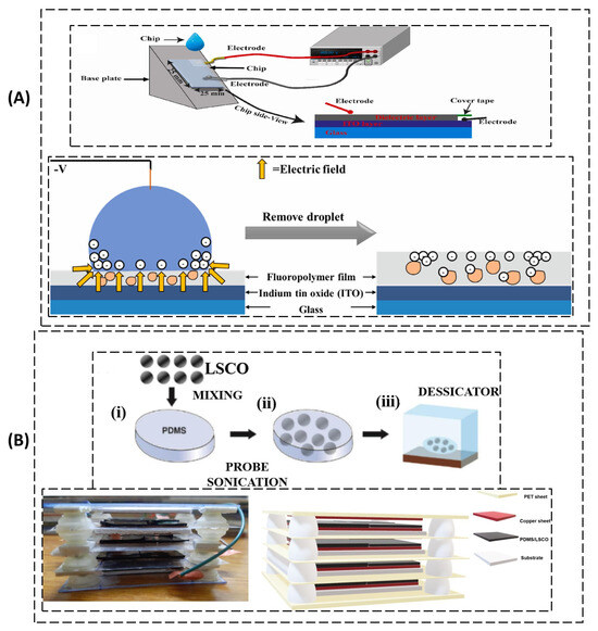 (A) Schematic illustration of droplet-based TENGs []. (B) Strontium-doped Lanthanum Cobalt Oxide (LSCO) LP-TENG. (i–iii) PDMS/LSCO composite preparation [].