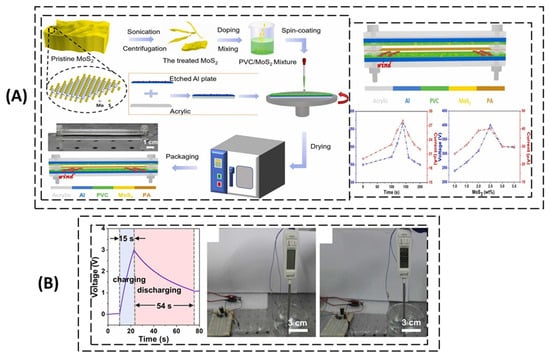 (A) Graphic depiction of PVC/MoS2 fabrication process and output voltages. (B) Charging and discharging voltage–time curve; photographic representation of water thermometer without battery; photographic representation of temperature in water thermometer [].