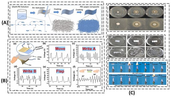 (A) PEI–paper-composite-based TENG, (B) (a) Schematic illustration of a pressure sensor. (b–f) Voltage responses when pressure is induced. (C) Pictorial depiction of anti-bacterial activity in PEI paper composite, Dissociation of PEI-paper composite, Burning process of paper air laid paper and PEI-paper composite [].