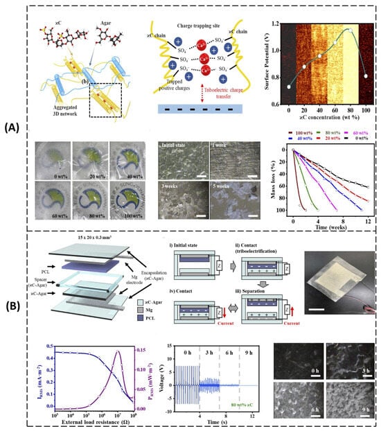 Kang et al. [] made a biodegradable TENG device using an x-carrageenan–Agar (xC–Agar) composite, which has been labeled as a high-performance triboelectric friction material, as represented in Figure 13. The advancement of biodegradable TENGs is necessary for the development of bio-transient electronics that are meant to be absorbed or dissolved within the body after a set duration; thus, surgically removing the device is not necessary, as illustrated in Figure 10. The xC–Agar composite is a natural polymer that consists of polysaccharides from red seaweed. The composite possesses a 3D aggregated porous network structure with an abundant number of charge-trapping sites, which are required for improving the triboelectric properties of the material. These charge-trapping sites, made of Ca2+ cations and sulphate ester groups, enhance the chances of an electron being withdrawn, i.e., they are unoccupied states, leading to a greater ability to donate electrons. They found that the xC–Agar composite demonstrated enhanced electron-donating properties, with the surface potential increasing by up to 57.5% compared to bare materials when the composite had an optimized xC concentration of 80 wt%. The fabricated, fully biodegradable TENG using the optimized xC–Agar composite, which is very thin (0.3 mm) and flexible, achieved a high-output root mean square (RMS) current density of 0.45 mA·m−2 and an output RMS power of 0.15 mW·m−2 at optimized impedance. The TENG successfully powered 10 commercial blue light-emitting diodes (LEDs) and charged 1 µF and 5 µF capacitors without requiring an external power source. Overall, they demonstrate the potential of the nature-derived xC–Agar composite as a high-performing triboelectric material for biodegradable TENGs, offering a promising avenue for powering bio-transient electronics.