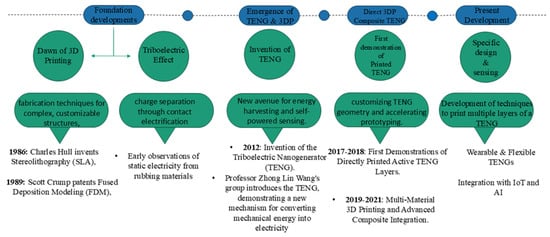Timeline of milestones in the development of composite-based 3D-printed TENGs.