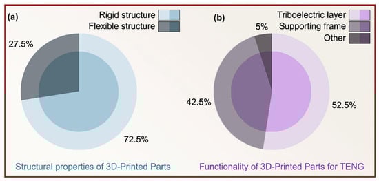 Three-dimensional printing part-fabrication analysis and data analytics for 3D-printed components: (a) percentage distribution of structural properties of 3D-printed parts in development of TENGs; (b) percentage distribution of functionalities used for the fabrication of 3D-printed TENGs [].