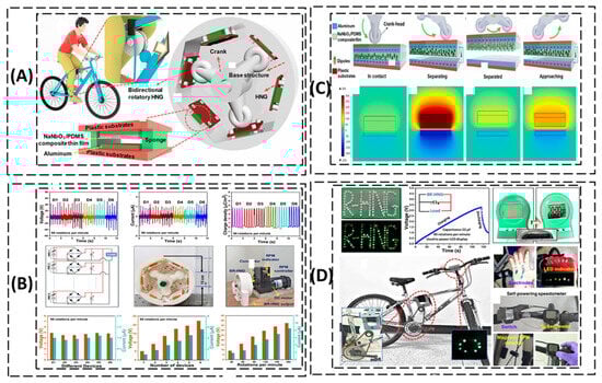 (A) Schematic representation of a bidirectional rotary hybrid nanogenerator. Integrated to a BR-HNG with a bicycle ridden by a human. (B) voltage, current, and charge density. (C) working mechanism of the hybrid nanogenerator. (D) DC voltage representation of BR-HNG and bicycle integration of BR-NHG [].