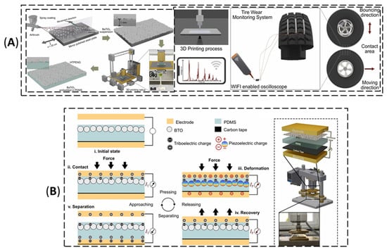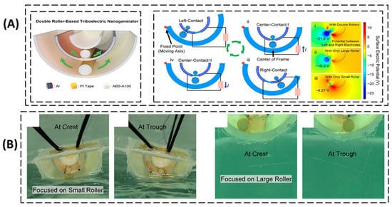 (A) Double-roller-based triboelectric nanogenerator; (B) Operation of double-sided electrode and DR-TENG (double-roller TENG) [].