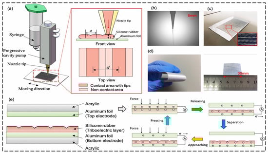 Experimental setup for DIW method and structural illustration of TENG: (a) experimental setup for fabrication process; (b–d) pictographic images of nozzle tip, TENG sample, and tribo-layer flexibility; (e) TENG working structure [].