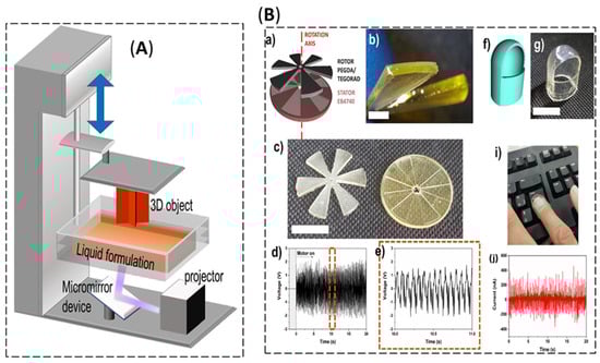(A) Sketched depiction of a DLP printer and a 3D-printed rotating TENG. (B) (a) schematics of 3D-printed rotating TENG; (b,c) rotary blades; (d,e) electrical voltage output; (f,g) CAD image and 3D-printed thimble; (i,j) thimble mounting and current output from TENG [].