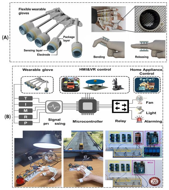 - Zhang, S.; Rana, S.S.; Bhatta, T.; Pradhan, G.B.; Sharma, S.; Song, H.; Jeong, S.; Park, J.Y. 3D printed smart glove with pyramidal MXene/Ecoflex composite-based toroidal triboelectric nanogenerators for wearable human-machine interaction applications. Nano Energy 2022, 106, 108110. [Google Scholar] [CrossRef]
