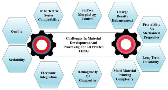 The fabrication of 3D-printed TENGs has utilized a diverse array of materials, including distinct surface morphologies, ink types, and surface topologies. The majority of researchers have attempted to optimize their results by using several materials of differing thicknesses. Triboelectric materials exhibit considerable diversity and need appropriate categorization and standardization. One can fabricate TENGs using any material that exhibits surface charge affinity. Conventional fabrication refers to a variety of materials with distinct nanogenerator combinations and thicknesses. Since 1757, contemporary smart self-powered gadgets have extensively utilized triboelectrification, a process that harnesses and transforms the conversion of environmental mechanical power into electrical energy. Material selection is crucial for optimum charge generation and efficient functioning in 3D TENG printing. We often use the triboelectric series to identify appropriate triboelectric materials. Triboelectrification and electrostatic induction are the two interrelated phenomena that facilitate the operation of TENGs, which gives the transfer of electrical charge between two substances with differing triboelectric properties to produce electric potential []. Consequently, the first stage in enhancing the triboelectric effect and output is to choose the optimal combination of materials exhibiting the greatest disparity in triboelectric affinity. Recent research has predominantly supported certain polymers because of their robust mechanical and triboelectric properties. The research focuses on modifying the polymer material after selecting the most promising materials. We diminish surface functionalization, elevate electrical permittivity, enlarge the contact area, refine the device architecture, and use enhanced manufacturing techniques. Nonetheless, choosing a suitable material is crucial for enhancing the triboelectric effect and producing a TENG with significant output []. Making high-performance 3D-printed triboelectric nanogenerators (TENGs) is a difficult task that requires a careful balance of the characteristics of the materials, the design of the structure, and the printing settings. Old-fashioned trial-and-error methods of experimentation take a lot of time and money. Digital optimization technologies like artificial intelligence (AI) and multiphysics simulations have the power to make big changes here []. These methods make the design and manufacturing process more efficient, smart, and predictive, which results in TENGs that operate better, last longer, and can be customized more easily. The main idea of the function of TENGs is as follows: when mechanical deformation happens (such as contact–separation, sliding, or bending), it creates charge (triboelectrification), which then leads to electrostatic induction, which makes electrical output. Accordingly, one can simulate the distribution of mechanical stress and strain in the 3D-printed structure under different loading circumstances, as well as the electrostatic fields and charge transfer at the triboelectric interfaces at the same time. This helps us estimate the output voltage, current, and power. AI and ML methods add to multiphysics simulations by making the TENG design and optimization process more automated and based on data. One may use ML algorithms to look at databases of material parameters (such as triboelectric potential, dielectric constant, and mechanical strength) to guess how novel, untested material combinations will work for TENGs. AI can create new material compositions or microstructures with the right qualities, speeding up the search for high-performance triboelectric and conductive composites for 3D printing. ML models, including neural networks and support vector machines, can learn how different 3D printing settings (like temperature, speed, infill, and orientation) affect TENG production, mechanical durability, and surface quality [].