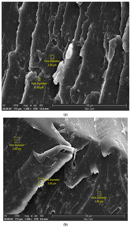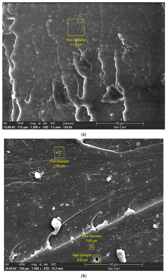 (a) 1500× magnified, Phase 1 aged neat specimen; (b) 2500× magnified, neat Phase 2 aged specimen.