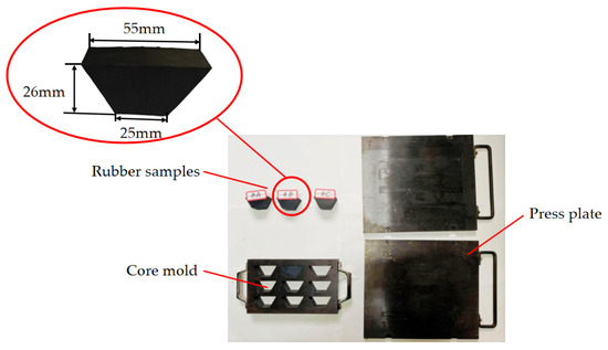 In order to study the friction characteristics of tread rubber and slippery road surface and to avoid chance results, three different formulations of tread rubber materials—A, B and C—were selected for the test (compound rubber supplied by the Guizhou Tyre Co., Ltd., Guiyang, China), and their respective sulphur curves were determined on a rubber processing analyser. According to the results, the appropriate vulcanization temperature of 150 °C and vulcanization time of 30 min were selected, and vulcanization was carried out under the vulcanization pressure of 15 MPa of the plate vulcanizing machine, and the test specimens were obtained. The test specimens of three formulations—A, B and C—were obtained; their hardness and tensile mechanical properties are shown in Table 1. Figure 1 shows the vulcanizing mould, including the core mould, upper and lower pressure plates and the three formulations of tread rubber specimens.