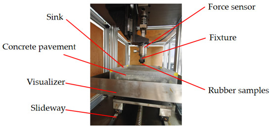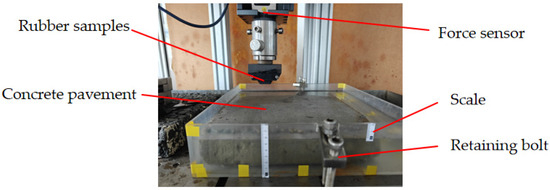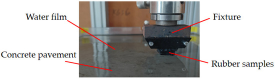 The test steps were as follows: Firstly, we fixed the tread rubber specimen on the supporting fixture, and we clamped and fixed a water tank with 0–10 mm scale on the horizontal moving table and put the concrete pavement into the water tank to limit and fix it. Fixing bolts were utilised to secure the sink to the horizontal moving table. Concurrently, a scale was affixed to the lateral aspect of the transparent sink to facilitate observation of the thickness of the water film, as shown in Figure 4. Then, according to the test requirements, we applied the weight load controlled by the hydraulic system as the normal force of the tread rubber specimen contacting with the pavement. And then, we added the different thickness of water film into the water tank according to the scale, and we controlled the horizontal moving table to drive the pavement sliding horizontally to form relative friction movement with the tread rubber specimen to carry out the wet slip friction test. Finally, different thicknesses of water film were added into the water tank according to the scale, and the horizontal moving table was controlled to drive the road surface to slide horizontally, forming relative friction movement with the tread rubber specimen to carry out the wet sliding friction test. The horizontal moving table was controlled by AC servo motor, which can drive the wet sliding cement pavement to reciprocate along the linear guideway with the speed range of 10–500 mm/min. The normal force of vertical load is obtained by the normal force sensor, and the horizontal friction force of tread rubber specimen is measured by the tangential force sensor.