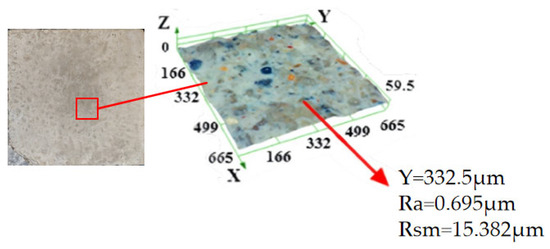 The dry and wet friction tests of tread rubber specimens are carried out on a comprehensive tyre friction testing machine; the said machine is shown in Figure 2. The device mainly consists of a specimen clamping part, a horizontal moving table and a force transducer. The fixture is used to fix the specimen in contact with the road surface and perform the wet slip resistance test under variable vertical load. The overall size of the device is 2000 mm × 500 mm × 1650 mm, and the size of the concrete pavement used for the test is 300 × mm 300 mm × 40 mm. The maximum contact pressure is about 1.2 MPa. The surface morphology of the concrete pavements utilised in the experimental setup was captured through the utilisation of OLYMPUS-DSX510 Optical Digital Microscope (Olympus, Tokyo, Japan). The arithmetic mean deviation of the profile at a specific cross-sectional height, designated as Ra, and the mean width of the profile elements, denoted as Rsm, were measured to characterise the roughness of the concrete pavements, as shown in Figure 3. The obtained data were employed to streamline the modelling and simulation of the sinusoidal pavements. The friction test data can be collected in real time by the force transducer, including the friction force and friction coefficient of the rubber block in the friction process and other important parameters.
