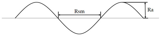 The contact between the tread and the road surface is characterised by a non-perfect fit, with contact only occurring at the bumps on the friction contact part of the two. The actual contact area constitutes a minor proportion of the theoretical contact area. Usually in the equivalent modelling process, the unevenness or bumps on the contact surface can be simplified as sinusoidal, cylindrical or hemispherical, and so on. In order to more accurately calculate the actual contact pressure between the tread rubber block and the road surface, this paper equates both the specimen surface and the uneven cross-section of the road surface to a sinusoidal curve, as shown in Figure 6. Where Ra is the amplitude of the sinusoidal curve, and Rsm is the half period of the curve, through the optical digital microscope photographed the concrete pavement morphology and the tread rubber block surface, the measurement statistics to obtain the respective contour arithmetic average deviation Ra and the average width of the contour Rsm. It can thus be concluded that the following equations are applicable in order to describe the curvature of the rough pavement: