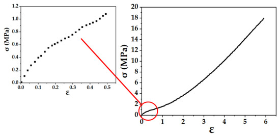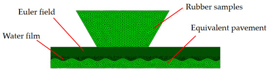 The three-dimensional finite element model of the friction between the tread rubber and the road surface is established in ABAQUS 2022. Uniaxial tensile tests were conducted on the tread rubber material to obtain its stress-strain relationship, as illustrated in Figure 7. It is evident that, owing to the absence of substantial deformation in the specimen during the wet friction experiment, the strain range is confined within the 0–30% interval. It is evident that the stress–strain relationship of the rubber material in this interval can be approximated as linear elastic. In order to simplify the modelling process, the hyperelastic model is not used for the tread rubber specimen modelling; rather, the linear elastic model is used instead. This approach ensures the credibility of the results, while concurrently achieving a substantial enhancement in the simulation calculation speed. The Young’s modulus of the simulated rubber samples was set at 5.46, and Poisson’s ratio at 0.48, according to the test data of the tread rubber. And the deformation of the road surface is negligible, which is defined as a discrete rigid body. We defined the range of Eulerian space for fluid motion and determine the thickness of the water film according to the test conditions, respectively, and limited the degrees of freedom of the water layer boundary conditions to prevent water layer loss. The rubber sample, the equivalent pavement and the Eulerian space are assembled, and then the mesh is divided, as shown in Figure 8.