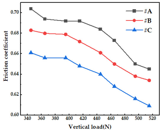 Figure 10 gives the results of the wet slip friction test of the three formulations—A, B and C trapezoidal rubber blocks—when different loads are applied under the test conditions of water film thickness of 5 mm and slip speed of 100 mm/min. Calculated from the size of the rubber block specimen and the range of variation of the applied vertical load, the surface pressure of the tread rubber in contact with the road surface ranges from 0.5 MPa to 0.8 MPa, which is close to the actual contact pressure of the tyre. It can be observed in Figure 6 that the friction coefficient under wet conditions decreases continuously with the increase of vertical load. Zhou et al. [1] used Fluent software to simulate and analyse the effect of different contact pressures on the friction coefficient of tyres in wet conditions, reaching the same conclusions as the above experiments. And the specimens of the three formulations show a 7–9% decrease in the friction coefficient under the condition of nearly 50% increase of vertical load.
