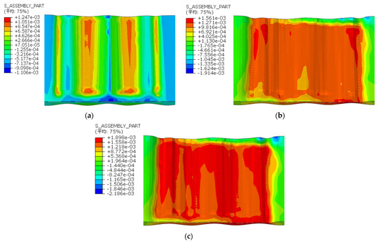 As illustrated in Figure 11, the results of 3D finite element fluid–solid coupling simulation, indicating the stress distribution formed inside the water film when the tread rubber sample is squeezed under different vertical loads. The results demonstrate that with an increase in vertical load, the stress of the water film gradually increases, indicating that the support reaction force of the water film on the tread rubber sample increases concomitantly. This results in a reduction of the support force of the road surface on the bottom surface of the sample, and eventually the wet slip friction coefficient appears to be reduced to a certain extent.