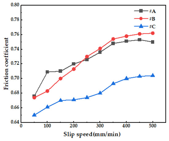Figure 12 shows the results of the wet slip friction test of three formulations—A, B and C trapezoidal rubber blocks—under the test conditions of vertical load of 345 N and water film thickness of 5 mm, varying only the slip speed of the horizontal table. Figure 12 shows the effect of slip speed on the wet slip friction coefficient. The results show that the coefficient of friction increases with the increase of slip speed. When the slip speed increases, the degree of wetting of the water film on the contact surface decreases and the friction coefficient appears to increase.