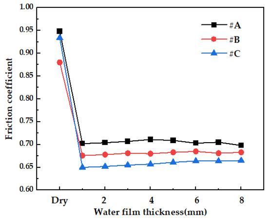 As demonstrated in Figure 13, the results of wet slip friction test of three formulations of A, B and C trapezoidal rubber blocks under the test conditions of vertical load of 345 N and slip speed of 100 mm/min, respectively, when the water film thickness is different. As can be seen from Figure 13, the friction coefficients of the three formulations of tread rubber during wet slip friction are significantly lower than the friction coefficients during dry rubbing. The decline in the coefficient of friction is especially evident following the formation of a thin water film measuring 0–1 mm. This finding aligns with the results obtained from the enhanced tyre–pavement friction model proposed by Zhao et al. [12]. And the friction coefficients of the different formulations of tread rubber decrease to different degrees, reflecting the differences in the wet slip performance of different formulations of rubber. It is evident that with an augmentation in the thickness of the water film, the wet slip friction coefficient undergoes negligible fluctuations, a phenomenon that is less perceptible in comparison to that observed on a dry road surface.