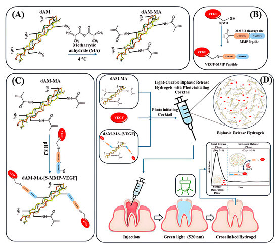 This study directly compares two injectable, dual-curing platforms (methacrylated decellularized amniotic membrane (dAM-MA) and GelMA), each formulated to provide biphasic VEGF release through a combination of free and MMP-cleavable conjugates. The central hypothesis is that while both systems can be tuned to produce a biphasic release profile, the dAM-MA platform will exhibit superior mechanical tunability, degradation control, and in vitro bioactivity due to the inherent complexity of its native ECM components. This paper, therefore, details the fabrication, physicochemical characterization, VEGF kinetics, and comparative in vitro performance of these platforms to establish a clinically relevant scaffold for pulp–dentin regeneration.
