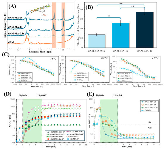 Physicochemical characterization of dAM-MA hydrogels. (A) ^1H NMR spectra showing methacrylate vinyl peaks (5.4–5.7 ppm). (B) Degree of methacrylation (DoM) by fluoraldehyde assay (mean ± SD; n = 3; * p < 0.001; ** p < 0.0001). (C) Shear-rate-dependent viscosities at 10, 25, and 37 °C for dAM-MA formulations and GelMA. Photogelation kinetics under 520 nm light (D) storage (G′, solid lines) and loss (G′′, dashed lines) moduli (E) tan δ (G′′/G′).