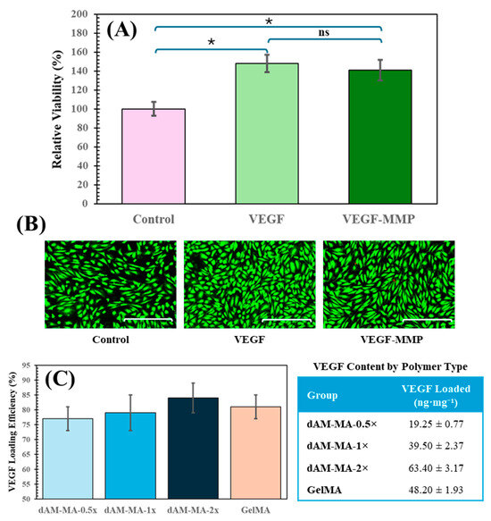 (A) HUVECs proliferation (MTT) with 50 ng/mL VEGF or VEGF-MMP (mean ± SD; * p < 0.001; ns = not significant). (B) Calcein-AM images of live HUVECs (scale bar = 200 µm). (C) VEGF loading efficiencies (%) and retained content (ng mg−1) in each hydrogel (mean ± SD; ns = not significant).