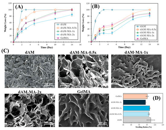 Hydrogel degradation was assessed under both enzymatic and hydrolytic conditions. Under enzymatic challenge with MMP-2 (Figure 4A), the unmodified dAM degraded rapidly, losing 25 ± 5% of its mass by Day 1 and fully degrading by Day 3. In contrast, functionalized hydrogels showed increased stability that correlated with a higher DoM. The dAM-MA-2x formulation was the most stable, losing only 20 ± 3% mass by Day 1 and retaining 15% of its mass at Day 14 (p < 0.01 vs. 0.5x at Day 1). The dAM-MA-1x and dAM-MA-0.5x hydrogels exhibited intermediate degradation profiles. GelMA demonstrated stability comparable to that of the dAM-MA-1x batch.
