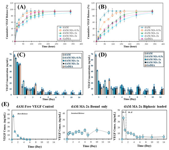 The hydrogel formulation and DoM significantly modulated the release kinetics of VEGF (Figure 5A–E). In the biphasic-loaded hydrogels, increasing the DoM reduced the initial burst release and prolonged the overall release profile. The burst release (at 12 h) was highest from unmodified dAM (56.0 ± 2.1%) and lowest from dAM-MA-2x (32.2 ± 1.2%). Consequently, the time to 50% cumulative release (t50) was shortest for dAM (10.7 ± 0.9 h) and longest for dAM-MA-2x (37.2 ± 3.1 h).