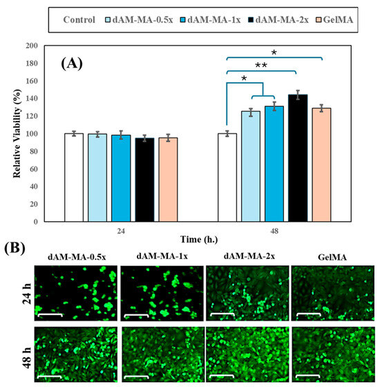 For cytocompatibility studies, hDPSCs were encapsulated in each hydrogel formulation (dAM-MA-0.5x, -1x, -2x, and GelMA) at a density of 2 × 106 cells/mL. The cell-laden precursors were photocured as 50 µL discs in a 96-well plate (n = 3 per condition).