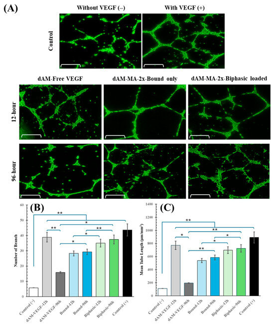 Branch point analysis mirrored these trends. At 12 h, the biphasic (38 ± 3 points) and bound-only (30 ± 4 points) groups were significantly higher than the negative control (5 ± 1 point; p < 0.001). At 96 h, the biphasic group (42 ± 4 points) maintained a more complex network than both the bound-only group (35 ± 3 points; p < 0.01) and the dAM-VEGF control (15 ± 2 points; p < 0.001). Representative fluorescence images further illustrate these differences in network morphology (Figure 7A,C; Calcein-AM; scale bars = 100 µm).