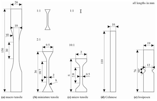 The quasi-static tensile tests were performed on samples of three different sizes. The macroscopic material characterisation was performed on ISO-size tensile samples according to ISO 527-4 [], with a reduced length of 90 mm and a width of 10 mm. On an intermediate scale, miniature samples with a length of 36 mm, a width of 2 mm, and fishtail ends for clamping were used. At the lowest scale, micro samples with gauge section widths of 0.2 mm and 0.5 mm, respectively, were employed. The exact specimen dimensions for all three levels are presented in Figure 1. The compressive response was investigated in Celanese compression tests according to ISO 14126 [] with a sample length of 110 mm and a width of 10 mm. To investigate the shear response, Iosipescu shear specimens according to ASTM D5379/D5379M [] with a width in the centre of the sample of 12 mm were manufactured. The dimensions of the shear and compression specimens are also presented in Figure 1.