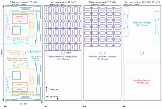 The samples for all experiments were manufactured using waterjet cutting. For all specimens except the micro specimens, the original plate thickness was used so that only the outer specimen contours needed to be cut. The basic material properties and their uncertainties were determined on samples from the batch with a 37.5 wt% fibre weight fraction. Additionally, ten tensile tests in the 0° direction were performed on the material variants with 28 wt% and 20 wt% fibre weight fractions, respectively, in order to study the effect of the fibre content and to make a connection to the breadboard experiments performed on these material variants. The sampling plan for the individual plates is presented in Figure 2.