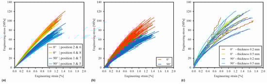 The results of the micro tensile test for specimens with thicknesses of 0.2 mm and 0.5 mm are presented in Figure 4c. A significant influence of the specimen thickness and the test direction cannot be observed. The stress–strain curves for both cases are found to lie within a common scatter band. However, the curves of the specimens in the 90° direction are much smoother compared to the specimens in the 0° direction. Comparing the stress–strain curves based on the larger specimens in Figure 4a,b, it is observed that the scatter-band width and thus the uncertainty in the material response increases further if the specimen size is further decreased. Clearly, the scatter-band width increases with decreasing specimen size due to a decrease in the self-averaging effect with decreasing size of the tested material volume.