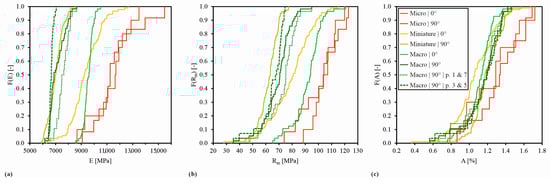 To investigate the uncertainty in the results in a quantitative manner, the results are evaluated in terms of (cumulative) probability distributions , describing the (cumulative) probability that a stochastic variable has a value of or less. The probability distributions for the Young’s moduli , the tensile strengths , and the fracture strains are presented in Figure 5, assuming a uniform distribution of the individual probability of occurrence for the individual experiments. A comparison between the results of the different specimen sizes shows that the median values of all three mechanical properties are significantly higher for the micro specimens. Furthermore, the range of values and the corresponding scatter-band width of the micro specimens are very similar for the 0° and 90° directions.