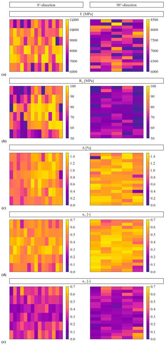 Spatial distributions of the results for the miniature tensile experiments in the 0° and 90° directions. (a) elastic moduli; (b) strengths; (c) failure strains; (d) first principal component of the fibre orientation tensor; (e) second principal component of the fibre orientation tensor.