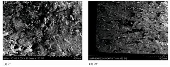 Selected fracture surfaces of the miniature specimens were investigated fractographically using scanning electron microscopy. In Figure 7a,b, selected fracture surfaces are presented for specimens tested with respect to the 0° and 90° directions, respectively. In both cases, mixed failure modes with matrix failure and fibre pull-out are observed. All visible fibres are blank and almost free from matrix adhering to their surfaces, indicating a weak fibre–matrix interface.