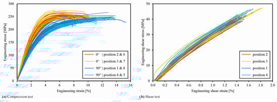 The tensile experiments were complemented by experiments under compressive and shear loads. The resulting engineering stress–strain curves are presented in Figure 8a,b, respectively. In the stress–strain results for the compression tests, two separate populations of curves are related to the experiments in the 0° and 90° directions, respectively (Figure 8a). For both test directions, a significant uncertainty in the stress–strain response is observed. The scatter-band widths for both test directions appear to be in the same order of magnitude.
