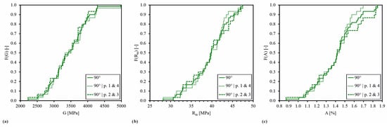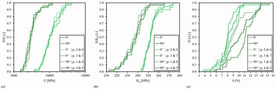 As for the tensile tests, the uncertainty of the compressive and shear response is evaluated quantitatively in terms of the cumulative probability distributions for the individual material parameters. The probability distributions for the Young’s moduli , the strengths , and the failure strains for the compression tests are presented in Figure 9. Their counterparts for the shear experiments are presented in Figure 10.