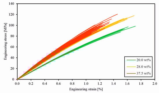 Stress–strain curves of ISO tensile specimens in 0° direction with different fibre mass contents.