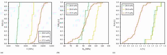 Probability distribution of ISO tensile specimens in 0° direction with different fibre mass contents. (a) elastic moduli; (b) strengths; (c) failure strains.