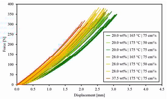 As a complement to the experiments on the coupon level with simple idealised constant and unidirectional loading conditions, breadboard experiments under multiaxial, spatially varying loading conditions were performed. The results in terms of the overall load vs. crosshead displacement curves are presented in Figure 13, distinguished in terms of the underlying manufacturing conditions. The effect of the different fibre mass contents on the measured resultant force is clearly visible. Furthermore, the maximum measured force is found to be higher for the higher process temperatures. A correlation between the maximum measured force and the injection speed cannot be observed. The significantly lower maximum force for the breadboards with a fibre mass content of 37.5 wt% is discussed in Section 4.