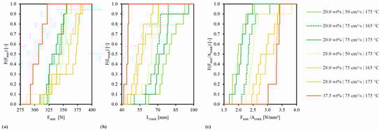 As for the coupon experiments, a quantitative assessment of the uncertainty in the different groups of results is performed in terms of the probability distributions for selected parameters. The (cumulative) probability distributions for the measured maximum force and the cumulative crack length are presented in Figure 14a,b. It is observed in Figure 14b that the cumulative crack length increases with decreasing fibre mass content. Furthermore, lower injection speeds result in larger cumulative crack lengths. In Figure 14c, the probability distributions for the ratio of maximum force to cumulative crack area as a measure of the (average) toughness are presented. It is observed that a non-negligible influence of the fibre mass content is present, with higher fibre mass fractions resulting in increased toughness of the material. For both the cumulated crack length developing at failure and the toughness measure , more narrow scatter bands and thus a less distinct uncertainty are observed for the highest fibre mass fraction of 37.5 wt%, compared to the cases with lower fibre mass contents. Furthermore, variations in the moulding temperature, as well as the injection speed, are found to have distinct effects on the mechanical properties of the breadboards.