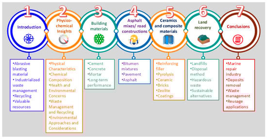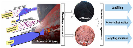 A very important aspect of industrialized waste management is the recycling of the grit blasting waste, which is produced by abrasive blasting procedures [9]. Several methods for the recycling of grit blasting waste are used in the industry, such as separation and reuse of abrasive media, metal recovery, cement and concrete applications, and, finally, landfill diversion via stabilization [9]. These recycling methods are crucial not only for mitigating the environmental impact by reducing the volume of waste sent to landfills but also for recovering valuable materials and conserving natural resources, thereby contributing to a more sustainable and circular economy [10]. This study reviews recent progress in both the materials and methods used for rust, marine growth, and paint removal in industrial and ship maintenance, and the logistics of transforming the waste generated into useful and valuable resources (Figure 1).