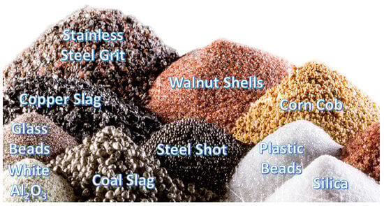 In the research by Hansel, a general overview of the sandblasting procedure is demonstrated. The principal method, the machinery, and the material media used are detailed. Steel is the most common and, due to its long life (it can be recycled up to 200 times), the most preferred material. It is necessary to establish an operating mix and monitor the amount of small, medium, and large particles to ensure the desired surface. On the other hand, Al2O3 is the popular choice for tough cleaning jobs. Al2O3 is offered in a wide range of sizes, from fine to extra coarse. It can be recycled several times as well. Interior rubber lining on blasting enclosures is also employed. Glass beads are a unique abrasive media developed to remove surface contaminants, without dimensionally affecting the cleaning surface. Glass beads are manufactured from a Pb-free, soda-lime-type glass, and contain no free SiO2. Their shape is almost perfectly spherical, ideal media for shot-peening uniformity [33].