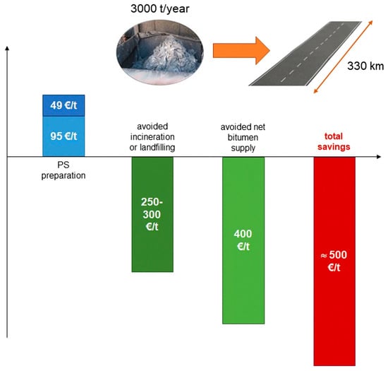 The work of Ruffino et al. involves deeply analyzing the financial costs in Italy and the environmental impacts related to the recycling process of paint sludge for the first time, through the lens of the spray application of paints in the automotive industry, as a modifier agent in bituminous binders used in hot-mixture asphalts for pavements (Figure 6). Previously, it was shown that the substitution of bitumen with up to 20 wt.% of PS in the hot-mixture asphalt binder was acceptable when considering the technical aspects of the pavement and did not create any environmental problem in the soil and water. The annual production of paint sludge from Italian automotive plants (3 ktpa) could correspond to 1.64 km2 of asphalt pavements (with an average road width of 5 m), which totals approximately 330 km. Drying and milling are required and must be carried out, but even with these treatments, we avoid incineration or disposal in a landfill for hazardous waste. The LCA analysis demonstrated that the reuse of paint sludge is a very promising eco-friendly method for paint-sludge waste management [62].