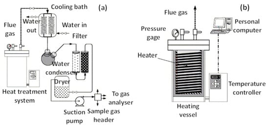 A schematic diagram of the heat treatment system including the gas absorption part (a) and the details of the heat treatment vessel (b), reproduced with permission [30].