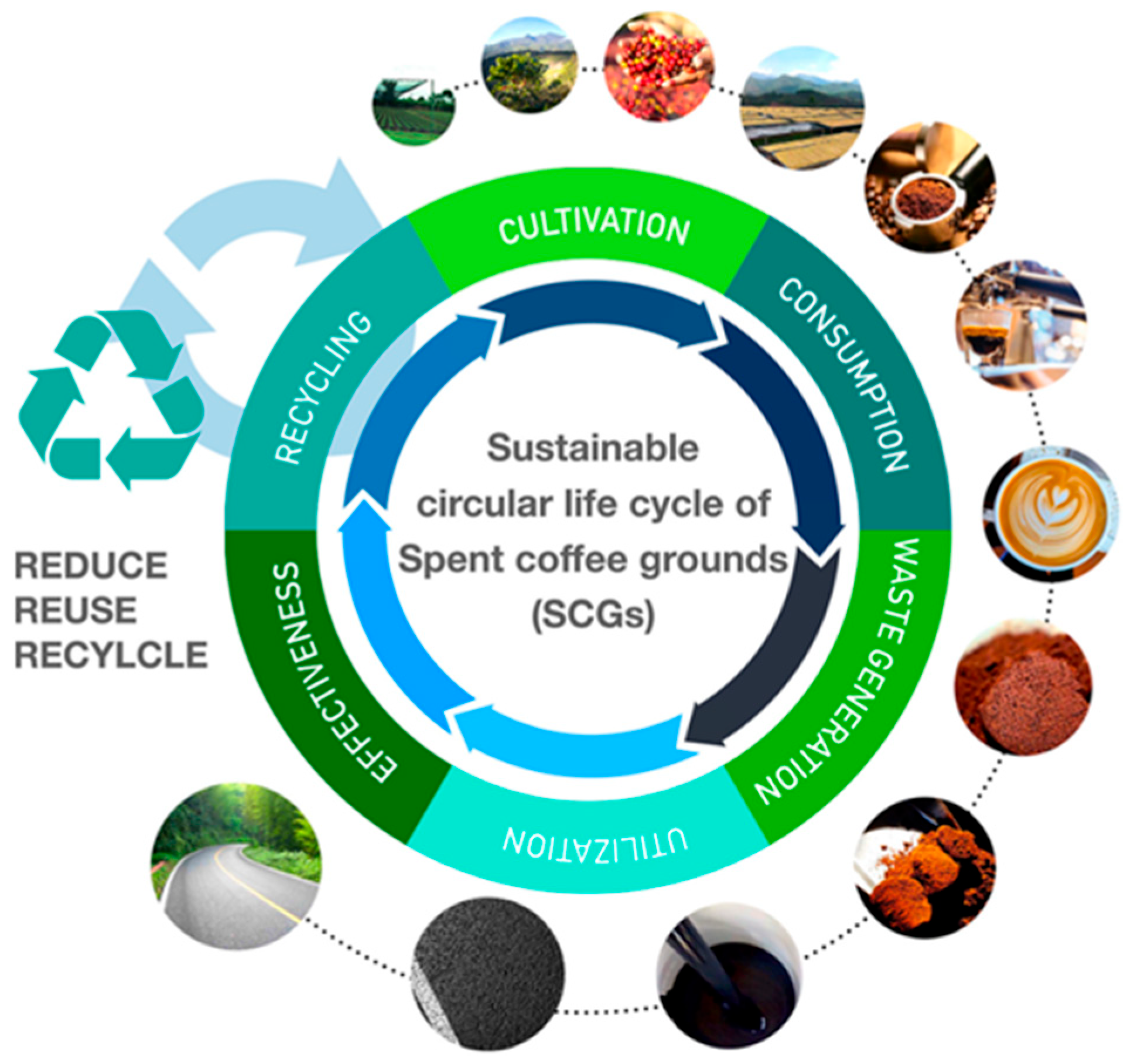 - Yusufoğlu, B.; Kezer, G.; Wang, Y.; Ziora, Z.M.; Esatbeyoglu, T. Bio-Recycling of Spent Coffee Grounds: Recent Advances and Potential Applications. Curr. Opin. Food Sci. 2024, 55, 101111. [Google Scholar] [CrossRef]